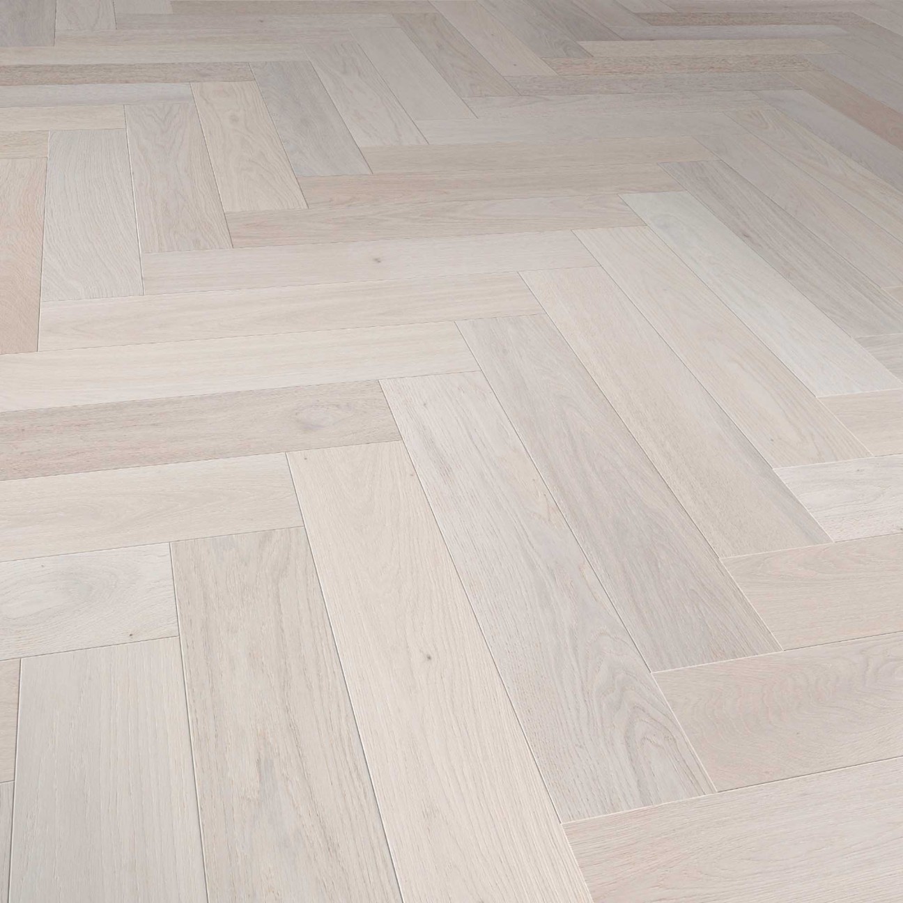 The wooden floors from the Heat collection are specially designed to be installed in combination with floor heating. Because of the high-quality plywood carrier and extremely thin top layer the heat conduction is especially efficient. With a certified heat resistance of 0,08 the entire Solidfloor Heat collection meets the highest standards. Because of this the floor maintains its maximum utility as no energy is lost. Besides the fact that the production takes place in Europe and naturally absorbs Co2, the floor is also very sustainable. The Heat Herringbone Nature White is an oak herringbone floor, finished with a special E-Protect (UV) lacquer. Because the floor is brushed the wood pattern is especially prominent. This is displayed beautifully in grazing light. The floor has a total thickness of 11mm including the high-quality 4 mm oak top layer. As part of the Nature wood selection, which allows less and smaller knots than in the Mill Run or Rustic selection, this floor has a serene and modern appearance. Periodical maintenance using the Solidfloor Easy Clean and Easy Protect will ensure that your floor stays beautiful for longer, lasting years. In short, this is a quality oak floor with a 25 year guarantee.