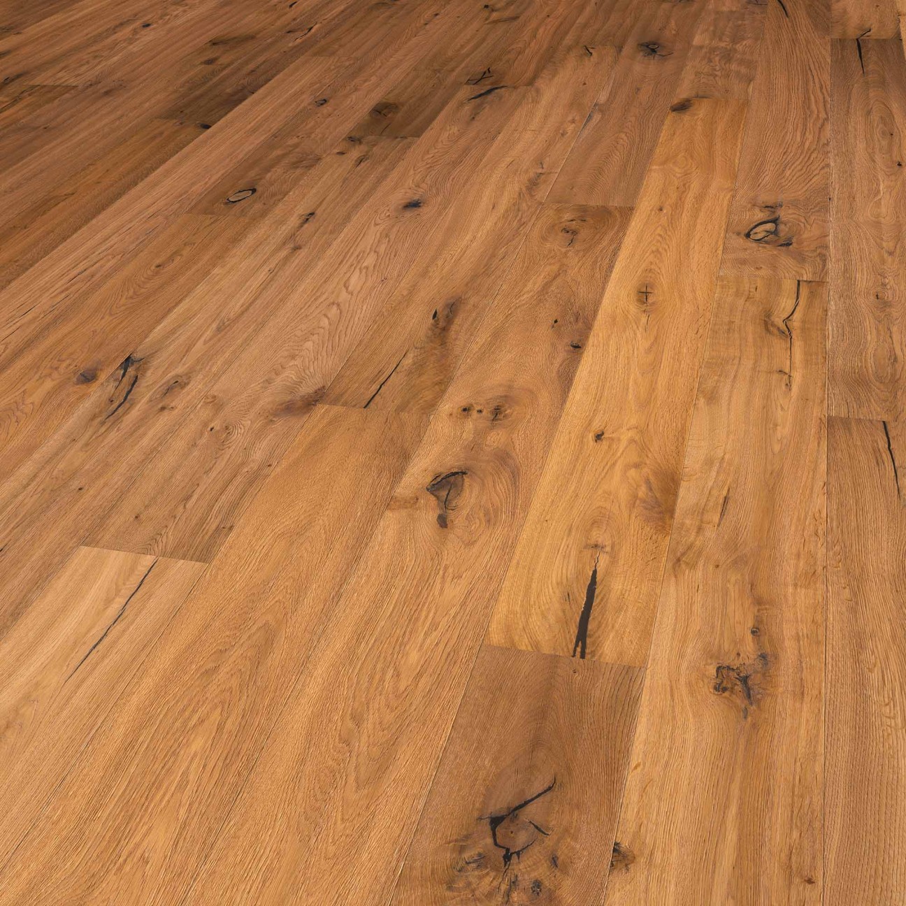 The Desert Smoked Natural Oil is a straight pattern smoked oak floor, finished with a natural oil. The floors from the Desert collection can be recognized by their sloping surface. This is because the floor are scraped by hand. This quality is displayed beautifully in grazing light. Because the floors are scraped by hand, each plank is slightly different, something that makes the floor unique and personal. The floor has a total thickness of 14mm, including a high-quality 3mm oak top layer. Because the floor parts are smoked, they obtain a deeper and darker colour. The Rustic+ wood selection, which permits several and larger knots than in the Nature or Rustic selection, gives the floor its lively appearance. The floor is finished with an oxidative oil. With periodical maintenance of the floor with Solidfloor Natural Hardwax Oil, the floor will remain beautiful longer, lasting for many years. In short, this is a high-quality oak floor with a 25-year warranty.