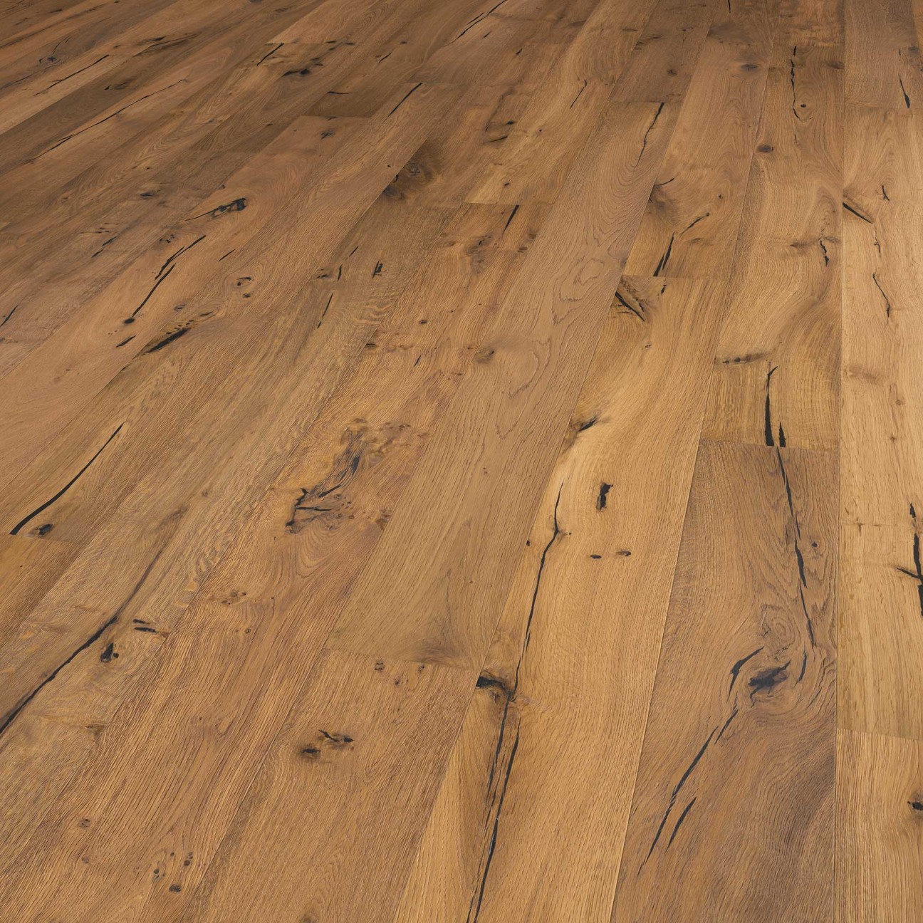 The Forest Smoked Natural Oil is a straight pattern smoked oak floor, finished with a natural oil. Suitable for floor heating and cooling (hydronic). Because the floors are brushed the wood pattern is especially prominent. This is displayed beautifully in grazing light. The floor has a total thickness of 14mm including the 3mm oak top layer. Because the floor parts are smoked they obtain a deeper and darker color. As this floor is part of the Rustic+ collection, where more and larger knots are permitted than in the Nature or Rustic selection, the floor has a lively appearance. The floor is finished with an oxidative oil. With periodical maintenance of the floor with Solid floor Natural Hard Wax Oil, the floor will stay beautiful for longer and last many years. In short, this is a quality oak floor with a 20 year guarantee.