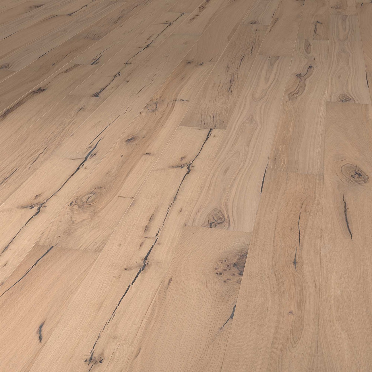 The Nordic from the Solidfloor Specials Collection is a straight pattern oak floor, finished with a white coloured oxidative oil. The floors from the Distressed selection are recognizable through the artificial ageing process they undergo. This process causes the floor to look like it has already been used for many years. Because of this these floors are well suited towards robust interiors such as industrial or rural styles. Because the ageing of each plank is unique, each plank looks slightly different, giving a unique character to the floor. The floor has a total thickness of 15 mm including the high-quality 4 mm oak top layer. As part of the Rustic+ Wood selection, which offers more and larger knots than in the Rustic or Mill Run selection, this floor has a lively appearance. Periodical maintenance with the Solidfloor Hardwax Oil White will keep the floor beautiful for longer, lasting many years. In short, this is a quality oak floor with a 25 year guarantee.