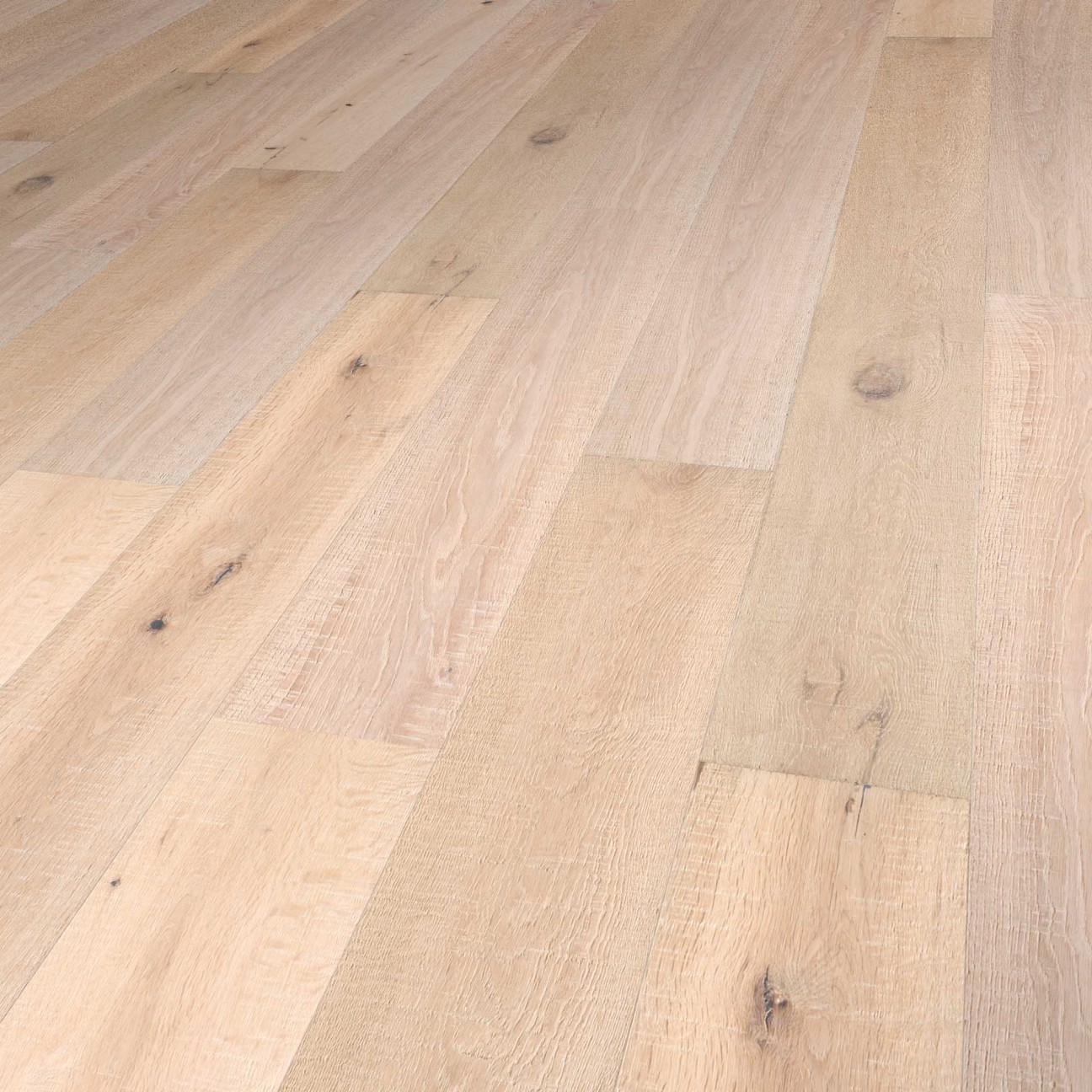 The New Hampshire from the Solidfloor Specials collection is a straight pattern wood floor, finished with a white coloured high solid (UV) oil. The floors from the Fine Sawn series are recognizable through the small saw cuts that go across the planks. This looks especially beautiful in grazing light. The floor is additionally hand scraped and hand brushed. Because it is fine sawn in the last treatment stage, this is the most noticeable treatment from the selection. Because the floors are hand scraped each plank is a little different, providing unique character to the floor. The floor has a total thickness of 15 mm including the high-quality 4 mm oak top layer. As part of the Rustic+ Wood selection, which offers more and larger knots than in the Rustic or Mill Run selection, this floor has a lively appearance. Periodical maintenance with the Solidfloor Hardwax Oil White will keep the floor beautiful for longer, lasting many years. In short, this is a quality oak floor with a 25 year guarantee.