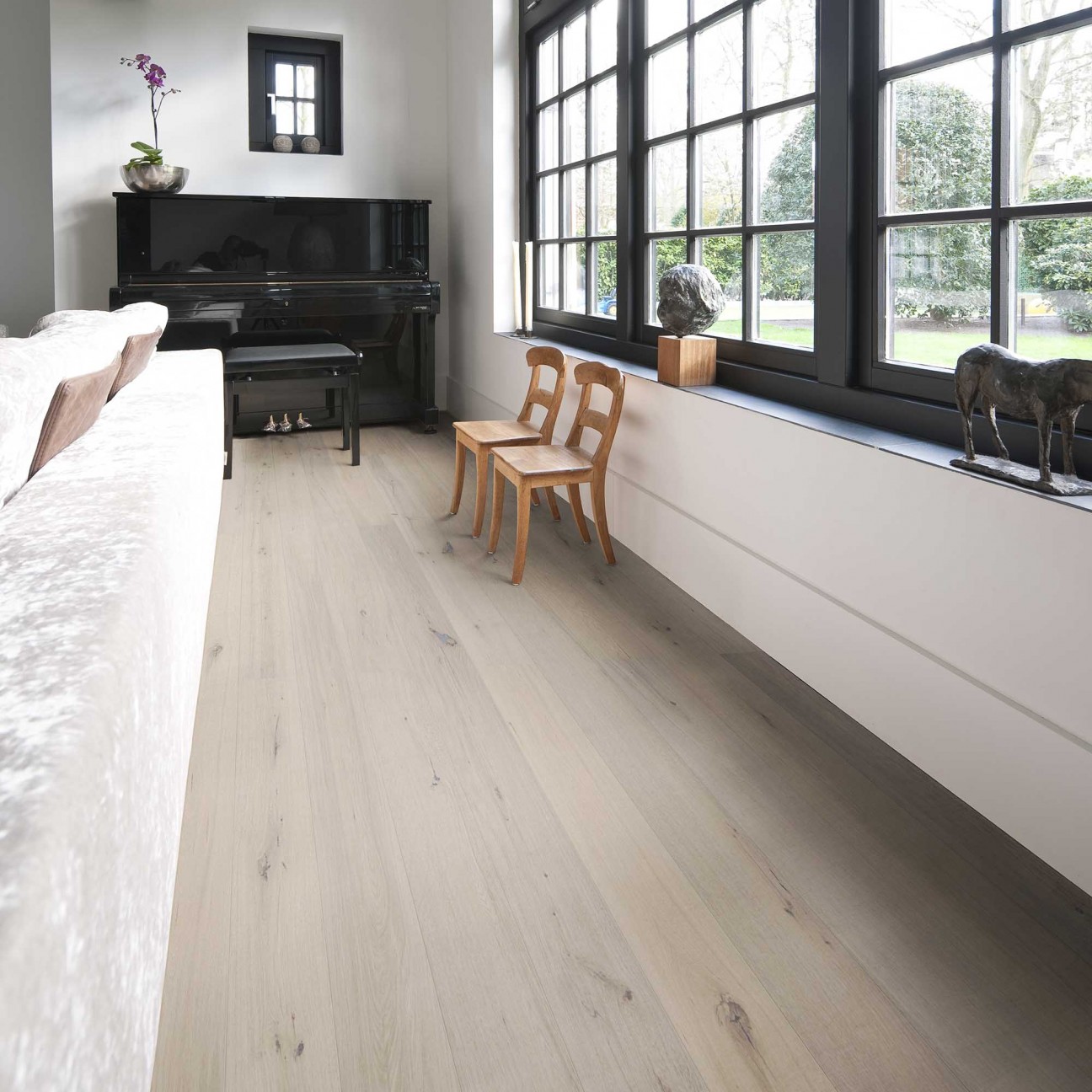 The Arctic from the Solidfloor Specials collection is a straight pattern oak floor, finished with a white oxidative oil. The floors from the Hand Scraped collection are recognizable through their sloping surface. This is because the floors are hand scraped. This is displayed beautifully in grazing light. Because the floor is hand scraped each plank is a little different, giving the floor unique character. The floor has a thickness of 15 mm including the high-quality 4 mm oak top layer. As part of the Rustic wood selection, which allows more and larger knots than in the Nature or Mill Run selection, this floor has a lively appearance. Periodical maintenance with the Solidfloor Hardwax Oil White will ensure that the floor stays beautiful for longer, lasting years. In short, this is a quality oak floor with a 25 year guarantee.
